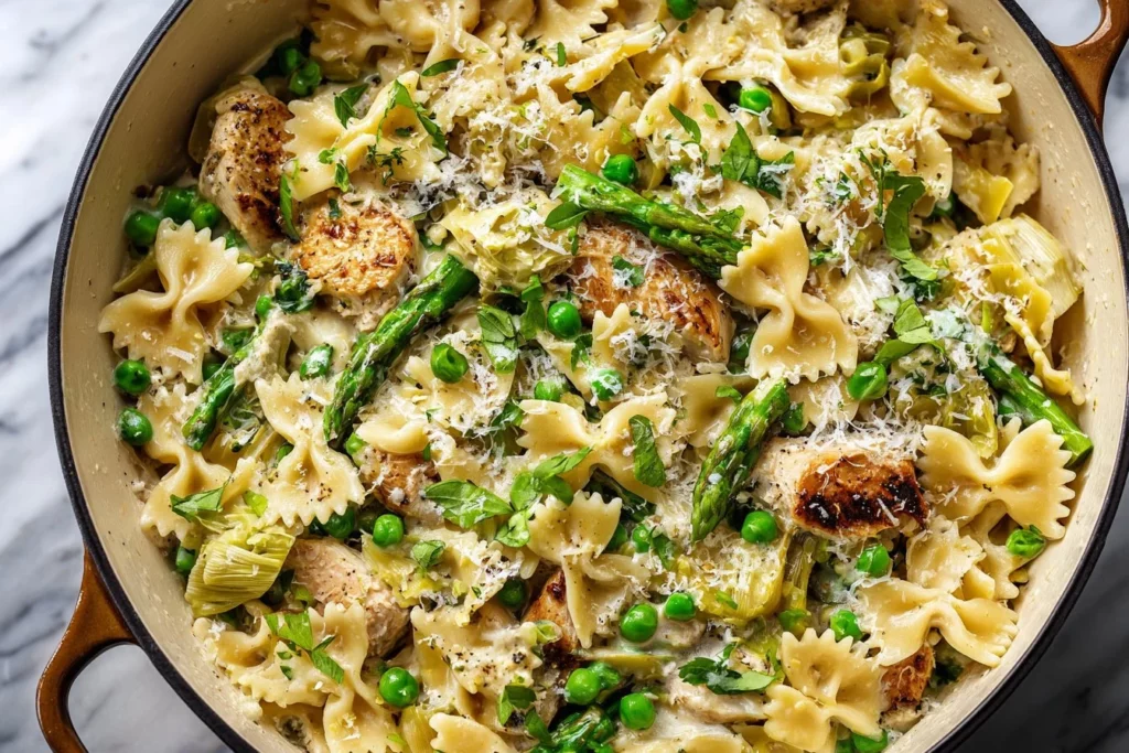 After 15 minutes, taste the pasta; if it’s not tender yet, cover and cook for another minute or so. When it’s ready, add the asparagus and artichokes, gently stir, and cover again. Cook until the asparagus is crisp-tender and most of the liquid is absorbed, about 3 minutes. Finally, uncover, add the cooked chicken and juices, along with the frozen peas, and stir everything together. Cook for another 30 seconds just until the peas are warmed through. Remove from heat and stir in the fresh basil before serving.