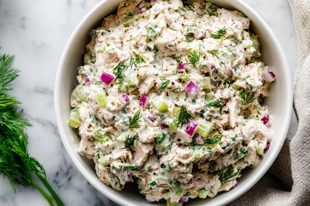 Start by dicing the celery and mincing the red onion. If you’re using fresh herbs, chop the parsley and dill as well. Next, open the cans of tuna and drain most of the liquid to avoid a watery salad.