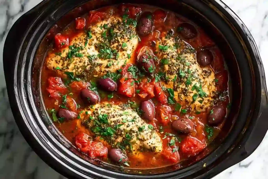 The slow cooker does most of the work, making this a great choice for busy weeknights or relaxed weekend cooking. As the chicken simmers, the tomatoes and olives create a light, savory sauce infused with oregano and basil. Served over couscous or quinoa, the result is a satisfying meal that feels fresh, hearty, and comforting without requiring complicated steps.