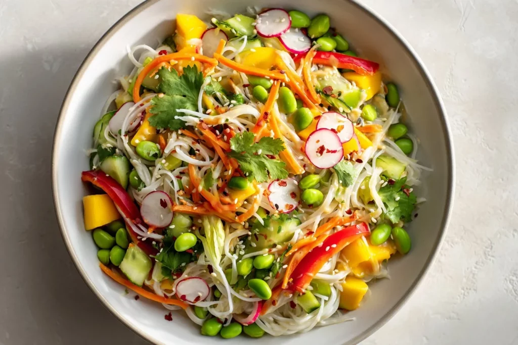 In a large mixing bowl, combine the cooled rice noodles, edamame, shredded carrots, sliced cucumbers, radishes, mangoes, green onions, and red bell pepper. Drizzle the peanut dressing over the top and toss gently until everything is well coated.